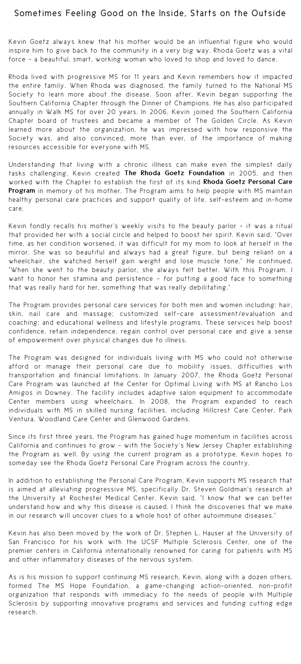 Sometimes Feeling Good on the Inside, Starts on the Outside Kevin Goetz always knew that his mother would be an influential figure who would inspire him to give back to the community in a very big way. Rhoda Goetz was a vital force – a beautiful, smart, working woman who loved to shop and loved to dance.   Rhoda lived with progressive MS for 11 years and Kevin remembers how it impacted the entire family. When Rhoda was diagnosed, the family turned to the National MS Society to learn more about the disease. Soon after, Kevin began supporting the Southern California Chapter through the Dinner of Champions. He has also participated annually in Walk MS for over 20 years. In 2006, Kevin joined the Southern California Chapter board of trustees and became a member of The Golden Circle. As Kevin learned more about the organization, he was impressed with how responsive the Society was, and also convinced, more than ever, of the importance of making resources accessible for everyone with MS.   Understanding that living with a chronic illness can make even the simplest daily tasks challenging, Kevin created The Rhoda Goetz Foundation in 2005, and then worked with the Chapter to establish the first of its kind Rhoda Goetz Personal Care Program in memory of his mother. The Program aims to help people with MS maintain healthy personal care practices and support quality of life, self-esteem and in-home care.   Kevin fondly recalls his mother’s weekly visits to the beauty parlor – it was a ritual that provided her with a social circle and helped to boost her spirit. Kevin said, “Over time, as her condition worsened, it was difficult for my mom to look at herself in the mirror. She was so beautiful and always had a great figure, but being reliant on a wheelchair, she watched herself gain weight and lose muscle tone.” He continued, “When she went to the beauty parlor, she always felt better. With this Program, I want to honor her stamina and persistence – for putting a good face to something that was really hard for her, something that was really debilitating.”   The Program provides personal care services for both men and women including: hair, skin, nail care and massage; customized self-care assessment/evaluation and coaching; and educational wellness and lifestyle programs. These services help boost confidence, retain independence, regain control over personal care and give a sense of empowerment over physical changes due to illness.   The Program was designed for individuals living with MS who could not otherwise afford or manage their personal care due to mobility issues, difficulties with transportation and financial limitations. In January 2007, the Rhoda Goetz Personal Care Program was launched at the Center for Optimal Living with MS at Rancho Los Amigos in Downey. The facility includes adaptive salon equipment to accommodate Center members using wheelchairs. In 2008, the Program expanded to reach individuals with MS in skilled nursing facilities, including Hillcrest Care Center, Park Ventura, Woodland Care Center and Glenwood Gardens.   Since its first three years, the Program has gained huge momentum in facilities across California and continues to grow – with the Society’s New Jersey Chapter establishing the Program as well. By using the current program as a prototype, Kevin hopes to someday see the Rhoda Goetz Personal Care Program across the country.   In addition to establishing the Personal Care Program, Kevin supports MS research that is aimed at alleviating progressive MS, specifically Dr. Steven Goldman’s research at the University at Rochester Medical Center. Kevin said, “I know that we can better understand how and why this disease is caused. I think the discoveries that we make in our research will uncover clues to a whole host of other autoimmune diseases.”   Kevin has also been moved by the work of Dr. Stephen L. Hauser at the University of San Francisco for his work with the UCSF Multiple Sclerosis Center, one of the premier centers in California internationally renowned for caring for patients with MS and other inflammatory diseases of the nervous system.    As is his mission to support continuing MS research, Kevin, along with a dozen others, formed The MS Hope Foundation, a game-changing action-oriented, non-profit organization that responds with immediacy to the needs of people with Multiple Sclerosis by supporting innovative programs and services and funding cutting edge research.